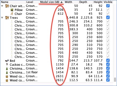 You may also display the Model size column in the furniture list with the Furniture > Display column > Model size menu item, to check the heaviest 3D models you use in your design (click on the Model size column header to sort the objects by size).