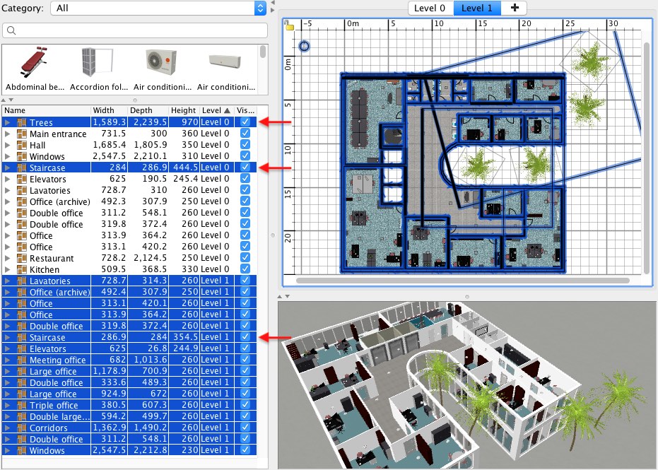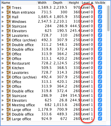 - Display the Level column in the furniture list by selecting Furniture > Display column > Level menu item, and sort the list by level clicking on its Level header.