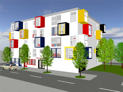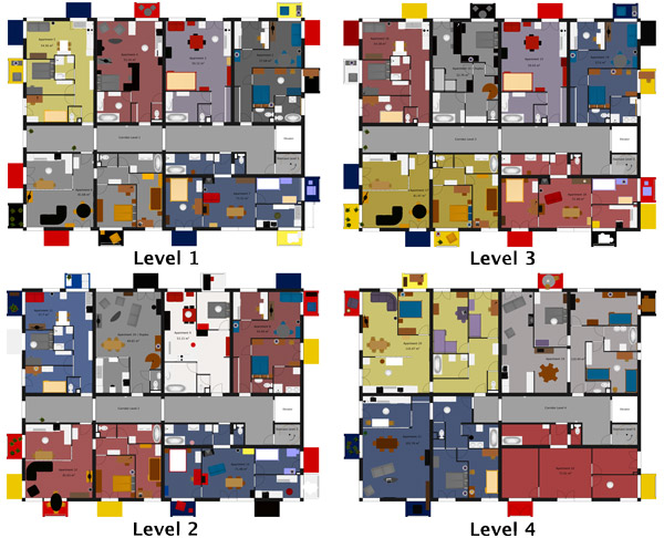 For example, the levels of the Sweet Home Residence example were built another way to propose different kinds of apartments, with their own configurations (only one or two studios are identical). Only the main walls, the water columns, the elevator door, the staircase, the corridor, the main doors and windows were duplicated at upper levels. Balconies and rooms were placed differently at each level, and many apartments were differently furnished, sometimes partly duplicated from other ones.