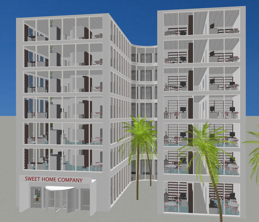 If you know the basics, it’s not especially difficult to design large buildings with Sweet Home 3D. It can even be quite fast if all the levels are similar, like in the Sweet Home Company example.