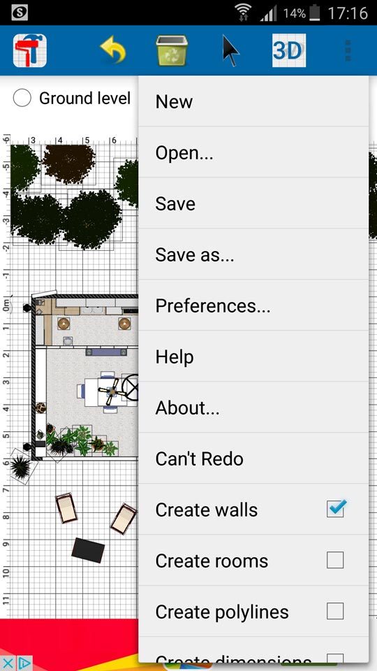 As these tablets or smartphones typically have a much smaller screen than a desktop, Phil Jordan altered the user interface of Sweet Home 3D to display its 4 panes in 4 different views navigated by swiping the screen, the plan being displayed by default. At the bottom of the screen, there is a banner showing ads that will be removable soon with an in-app purchase.