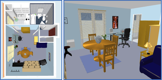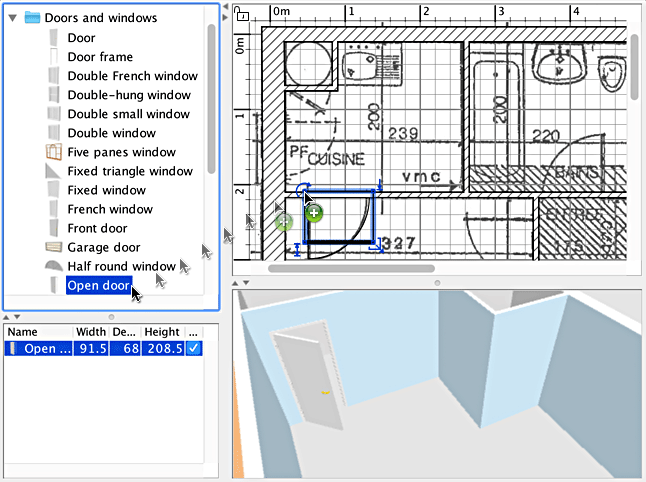 添加到房屋中的对象会同时在家具列表、房屋平面图以及 3D 视图 中被选中并显示。