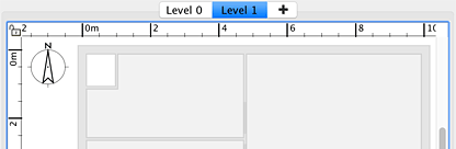 如果您的房屋有多个楼层或层级,您可以通过在菜单中选择 平面图 > 楼层 > 添加楼层,或点击当房屋具有多个楼层时出现的 + 标签,创建额外的楼层。每个楼层都由一个标签表示,该标签显示在平面图视图的顶部,用于选择将添加新墙体、家具和其他对象的楼层。