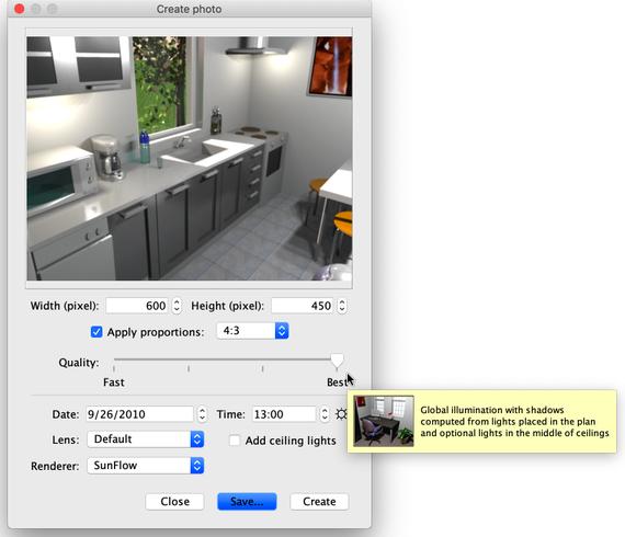 如图 24 所示,用于创建照片的窗格还允许您选择创建图像的质量级别。使用快速质量级别,创建的图像将如3D 视图中所示,而使用最佳质量级别,图像将更具照片真实感。在两个最佳质量级别,您可以通过以不同的功率级别添加灯或更改小时来管理图像的照明。您还可以选择用于计算图像的渲染引擎,因为 YafaRay 渲染器通常比 SunFlow 默认渲染器运行得更快。