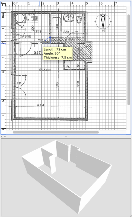 在绘制墙体时无需考虑门窗,因为 Sweet Home 3D 会自动计算墙体中用于放置开口的位置。如图 6 所示,墙体会同时显示在平面图和 3D 视图中,并且您可以随时在 3D 视图中 调整视角,方法是按住鼠标左键并移动鼠标。