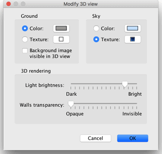 您还可以从菜单中选择 3D 视图 > 修改 3D 视图… 以更改地面和天空的颜色或纹理、光线亮度和墙壁透明度,如图 19 所示。