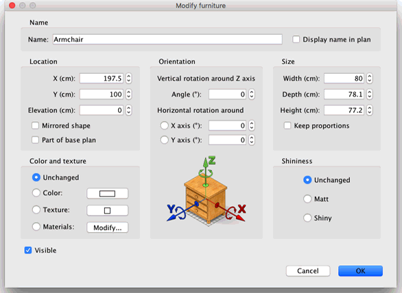 您还可以双击家具,或从菜单中选择 家具 > 修改…,通过家具对话框修改当前选中的项目。如图 10 所示,该对话框可帮助您编辑所选家具的名称、旋转角度、位置、离地高度、尺寸、颜色或 纹理、可见性,以及是否需要对 3D 模型形状进行镜像。如果所选对象包含一个或多个灯光,该对话框还允许您编辑其功率,但这一效果只会在 照片创建 面板的两个最高质量级别中体现。