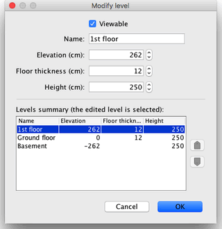 如图 15 所示,楼层修改窗格还显示一个描述房屋所有楼层的表格,以帮助您选择与其他楼层相比的正确值。要创建地下楼层,请输入负标高。楼层高度用于计算已编辑楼层天花板的标高。