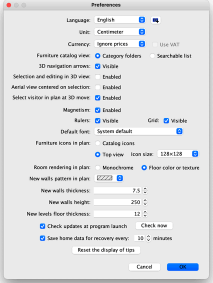 在继续之前,请显示“首选项”对话框,如图 3 所示,在 macOS 下使用 Sweet Home 3D > 偏好设置… 菜单项,或在其他系统下使用 文件 > 偏好设置… 菜单项。检查程序中使用的默认单位、墙壁的默认厚度和高度以及其他首选项。