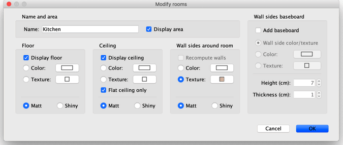 创建房间后,您可以通过从菜单中选择平面图 > 修改房间…来修改其名称、其地板和天花板的颜色或纹理,如图 13 所示。
