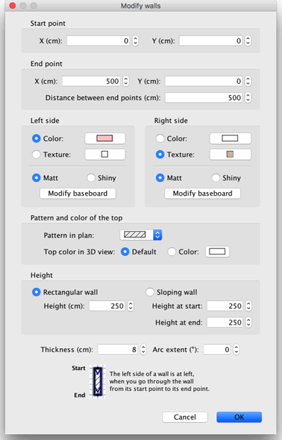 如图 7 所示,该对话框可帮助您编辑选中墙体左右两侧的颜色或纹理,以及它们的厚度和高度。如果您想使用自己的图像作为纹理,请点击 导入 按钮,并使用 纹理 导入向导,它将引导您完成操作。