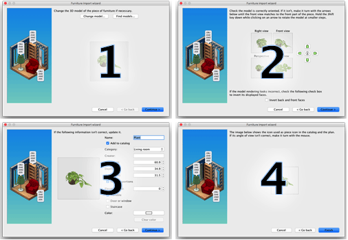- Turn the 3D model with the mouse to get the best point of view on the model for the model icon displayed in the furniture catalog, furniture list and home plan. Then click on Finish.