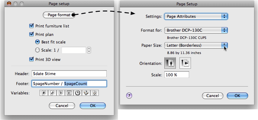 从菜单中选择 文件 > 页面设置… 可修改这些默认设置(该功能在 Online 和移动版本中不可用),以及打印平面图的比例、页眉和页脚,如图 23 所示。