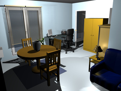 如果您希望在 Blender 或 Art of Illusion 等 3D 软件中重新使用您的房屋,以例如改进其 渲染效果,请选择菜单中的 3D 视图 > 导出为 OBJ 格式…,并将生成的 OBJ 文件导入这些软件中(该功能在 Online 和移动版本中不可用)。该菜单项会在选定的 OBJ 文件中写入 3D 视图 中显示的所有对象的描述,创建一个描述其颜色的 MTL 文件,并最终保存所使用的纹理图像。图 28 显示了在场景中添加了一些灯光后于 Blender 中完成的渲染效果。